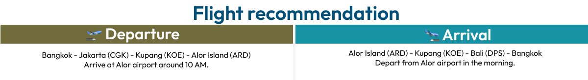 การเดินทางของเส้นทาง Alor จะมีการต่อเครื่อง 2 ครั้ง ครั้งแรกที่ Jakarta (CGK) จากนั้นเดินทางต่อไปยังสนามบิน Kupang (KOE) และจากคูปังไปยัง Alor Island (ARD) จากสนามบินไปยังท่าเรือใช้เวลาประมาณ 30 นาที