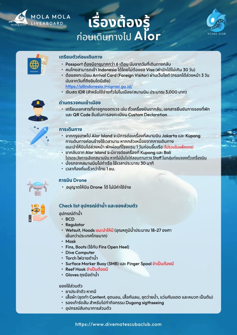 *บริษัทฯ ขอสงวนสิทธิ์ในการเปลี่ยนแปลงรายละเอียดทัวร์บางประการ หรือสลับวันโดยมิต้องแจ้งให้ทราบล่วงหน้าเมื่อเกิดเหตุสุดวิสัย อาทิเช่น คลื่นลม สภาพอากาศท้องถิ่น ณ เวลานั้น เรือที่ใช้มีเหตุขัดข้อง กฏการดำน้ำของทางอุทยาน หรือกฏหมายของแต่ละประเทศ รวมทั้งเส้นทาง Dive Site ในรายการที่กล่าวข้างต้น สามารถเปลี่ยนแปลงได้ตามความเหมาะสม ทั้งนี้บริษัทจะคำนึงถึงประโยชน์และความปลอดภัยเป็นสำคัญ