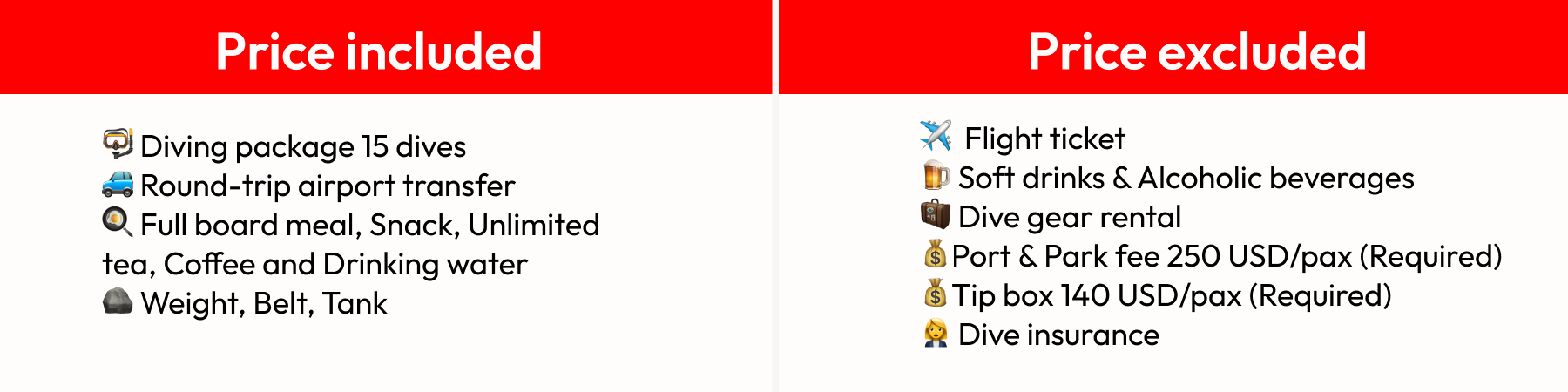 *บริษัทฯ ขอสงวนสิทธิ์ในการเปลี่ยนแปลงรายละเอียดทัวร์บางประการ หรือสลับวันโดยมิต้องแจ้งให้ทราบล่วงหน้าเมื่อเกิดเหตุสุดวิสัย อาทิเช่น คลื่นลม สภาพอากาศท้องถิ่น ณ เวลานั้น เรือที่ใช้มีเหตุขัดข้อง กฏการดำน้ำของทางอุทยาน หรือกฏหมายของแต่ละประเทศ รวมทั้งเส้นทาง Dive Site ในรายการที่กล่าวข้างต้น สามารถเปลี่ยนแปลงได้ตามความเหมาะสม ทั้งนี้บริษัทจะคำนึงถึงประโยชน์และความปลอดภัยเป็นสำคัญ