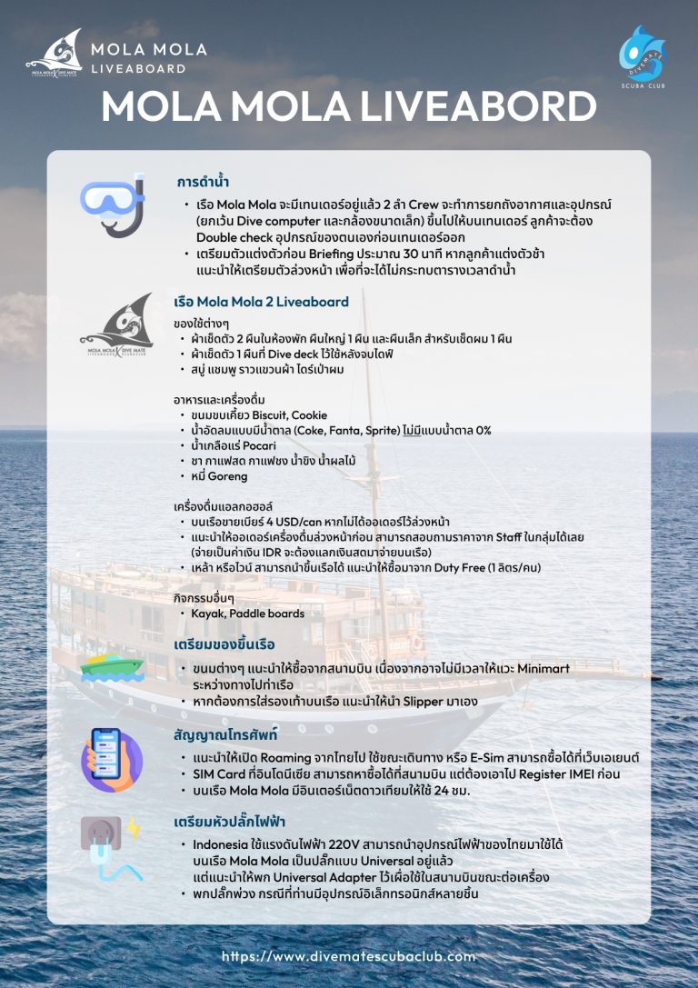 09:00 เช็คอินที่ Mola Mola 2 Liveaboard เก็บของเข้าห้องพัก