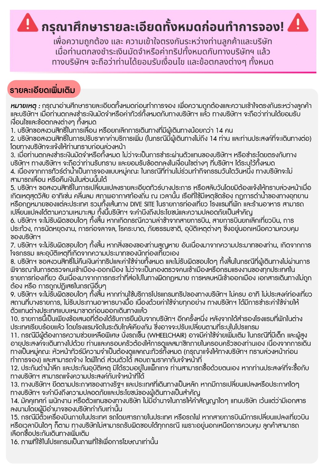 *บริษัทฯ ขอสงวนสิทธิ์ในการเปลี่ยนแปลงรายละเอียดทัวร์บางประการ หรือสลับวันโดยมิต้องแจ้งให้ทราบล่วงหน้าเมื่อเกิดเหตุสุดวิสัย อาทิเช่น คลื่นลม สภาพอากาศท้องถิ่น ณ เวลานั้น เรือที่ใช้มีเหตุขัดข้อง กฏการดำน้ำของทางอุทยาน หรือกฏหมายของแต่ละประเทศ รวมทั้งเส้นทาง Dive Site ในรายการที่กล่าวข้างต้น สามารถเปลี่ยนแปลงได้ตามความเหมาะสม ทั้งนี้บริษัทจะคำนึงถึงประโยชน์และความปลอดภัยเป็นสำคัญ