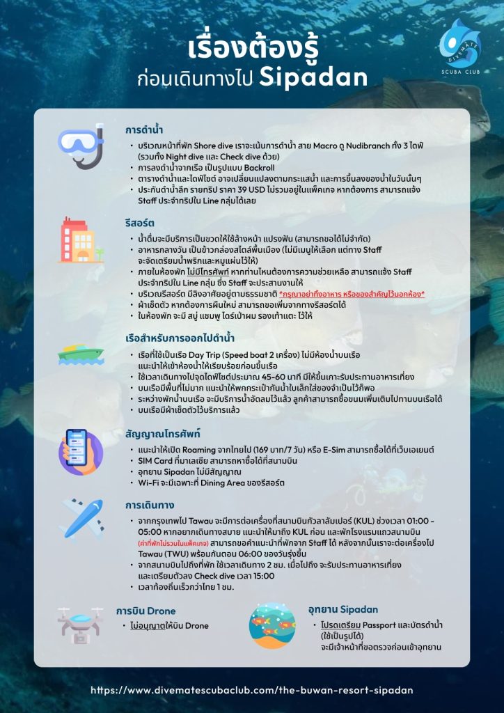 06:00 เดินทางออกจากกัวลาลัมเปอร์  พบกันที่สนามบิน Tawau 09:30-10:30 และเราจะนั่งรถตู้ของทางรีสอร์ตเดินทางไป The Buwan Dive Resort ใช้เวลาประมาณ 1:30-2 ชั่วโมง